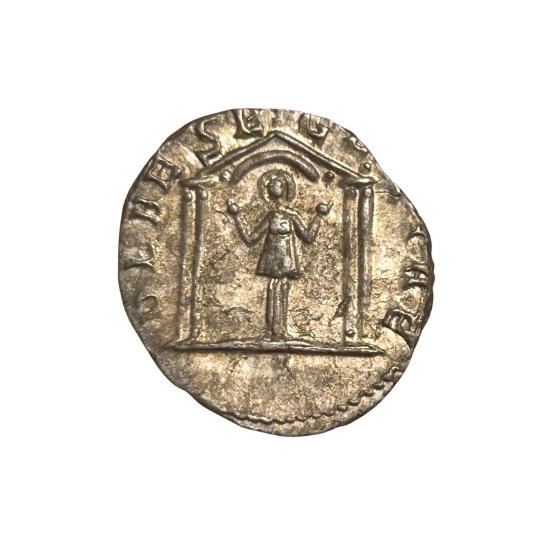 Revers: Segetia, coiffée d'un nimbe radié debout de face, les bras tendus dans un temple tétrastyle à fronton triangulaire coupolé.