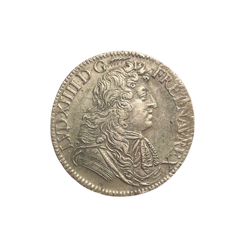 Avers: Buste drapé et cuirassé de Louis XIV, à droite avec le col de dentelle, la chevelure longue, armure non cloutée.